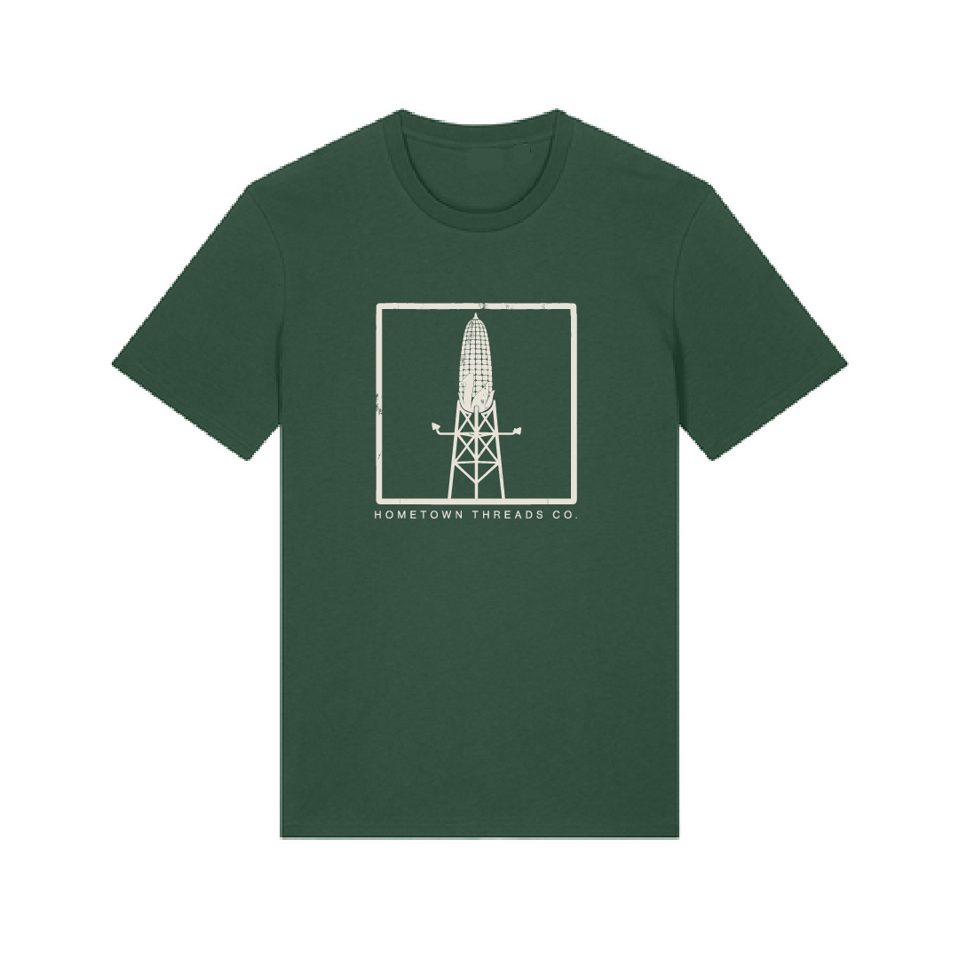 A Hometown staple. This forest-green tee features the iconic Corn Tower framed in a minimal line design — a simple nod to local pride without shouting it. Clean, classic, and part of the Essentials collection made for everyday wear.