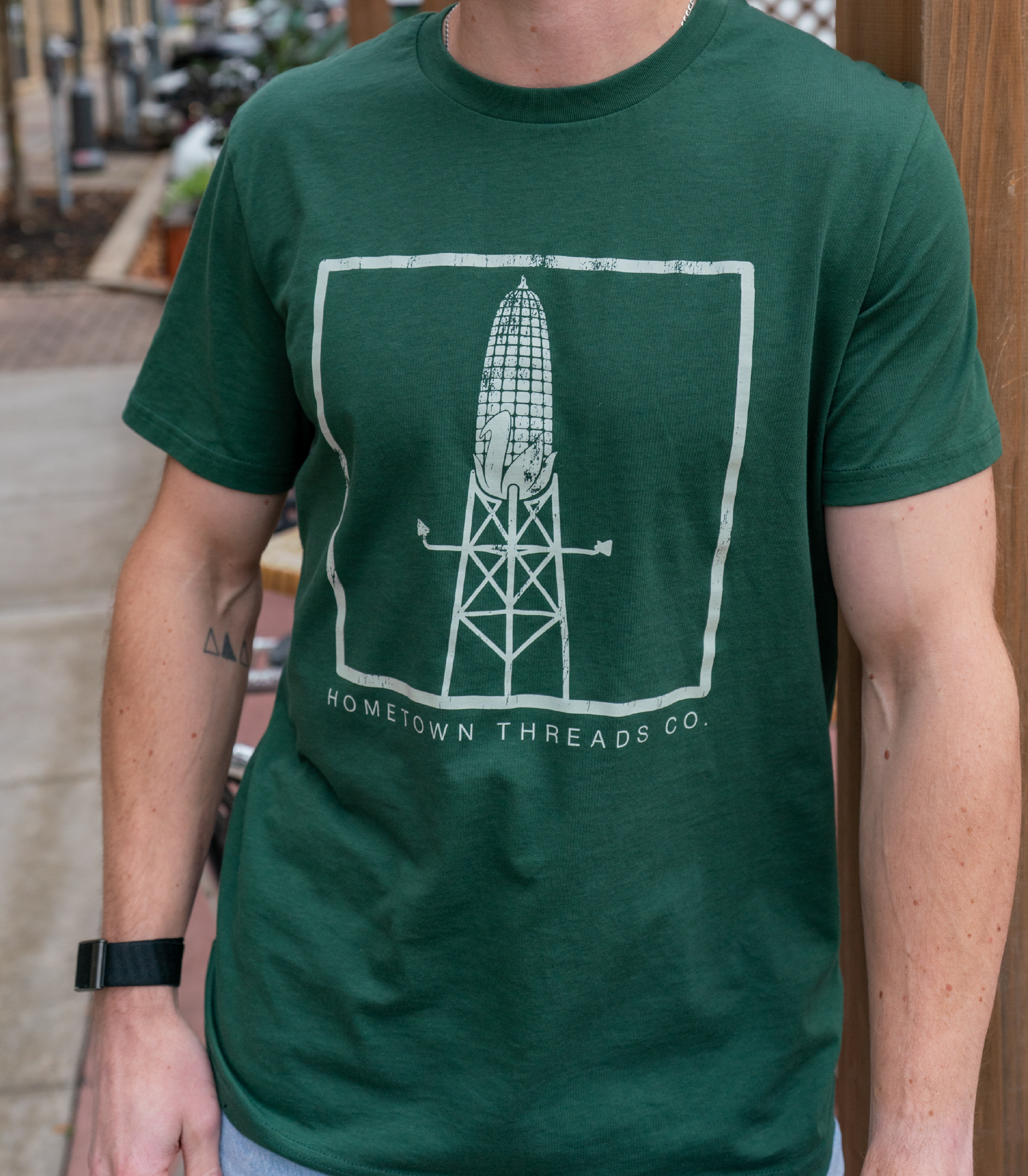 Front Print: Framed Corn Tower graphic with “Hometown Threads Co.” text in bone ink.