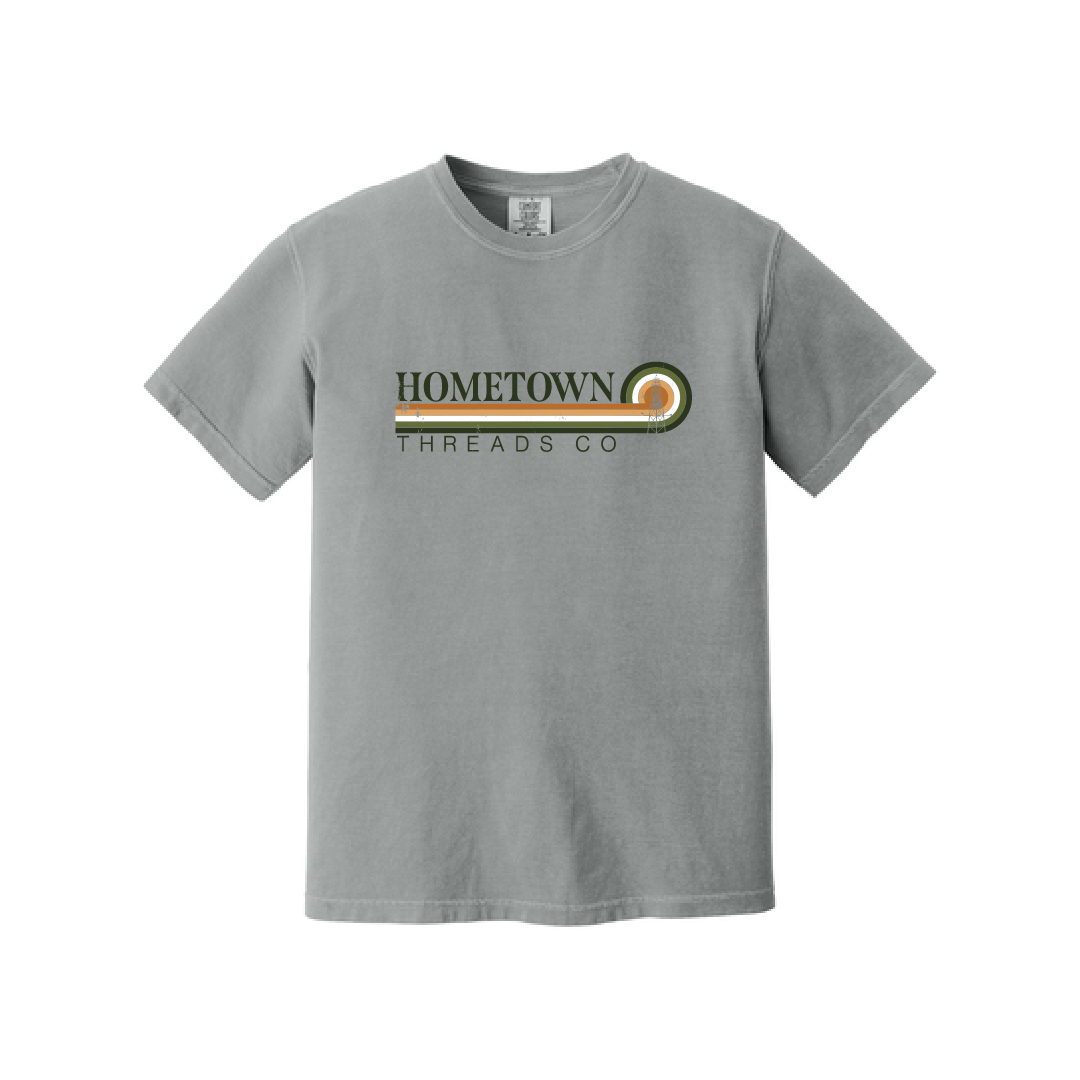 Front Print: Retro Hometown Threads Co. stripe graphic in harvest-inspired tones.