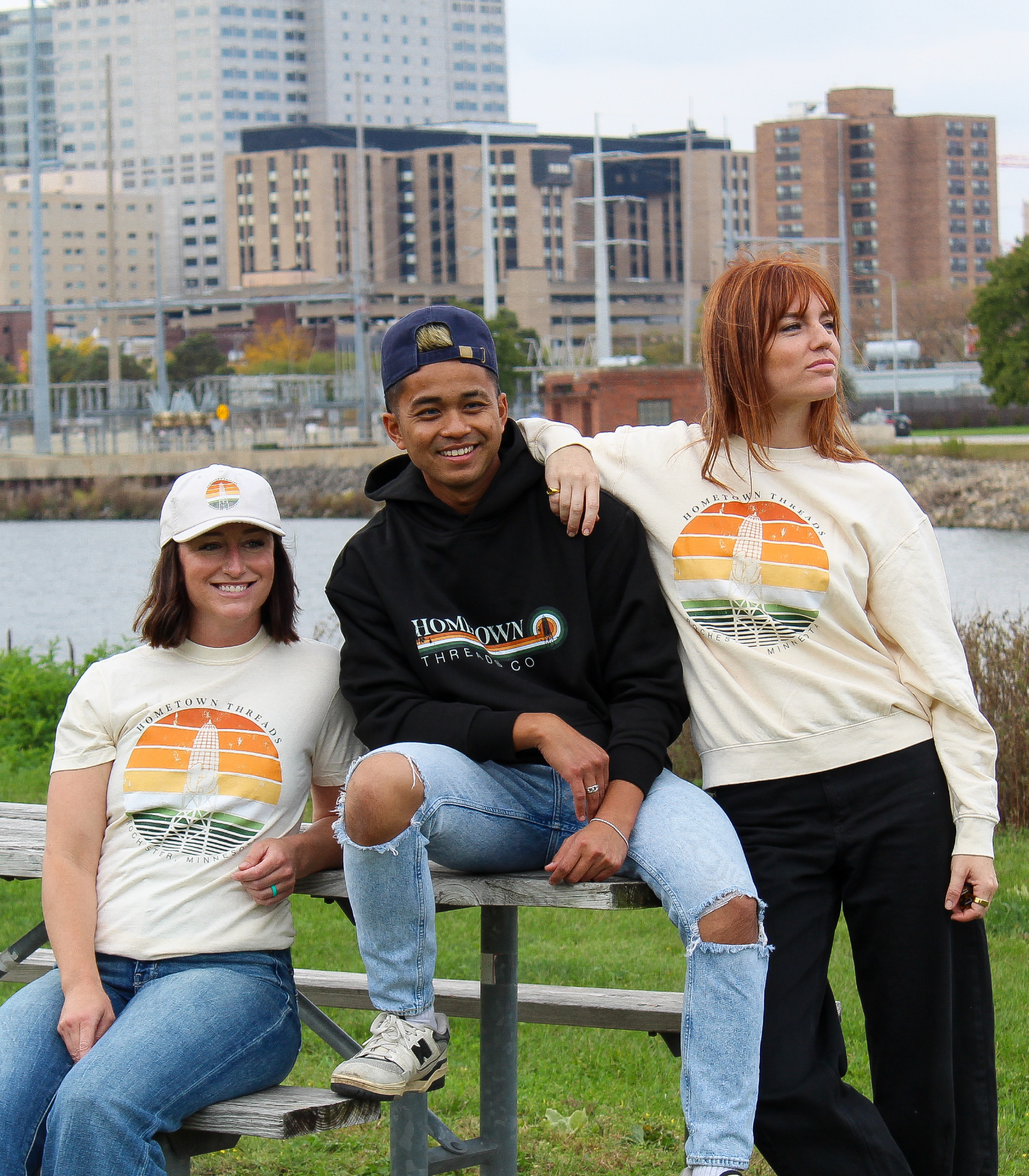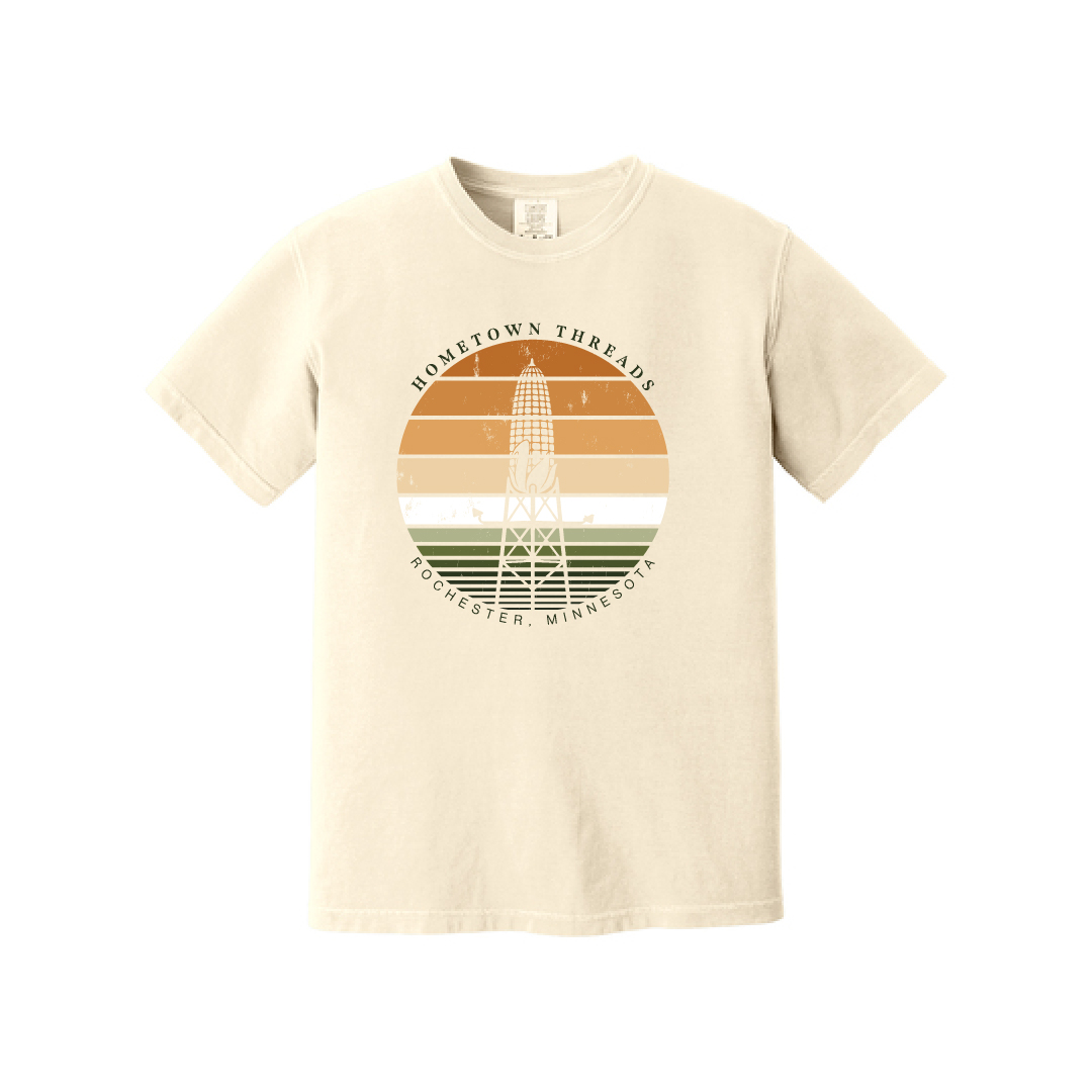 • Front Print: Retro circular Corn Tower graphic with “Hometown Threads — Rochester, Minnesota.”
