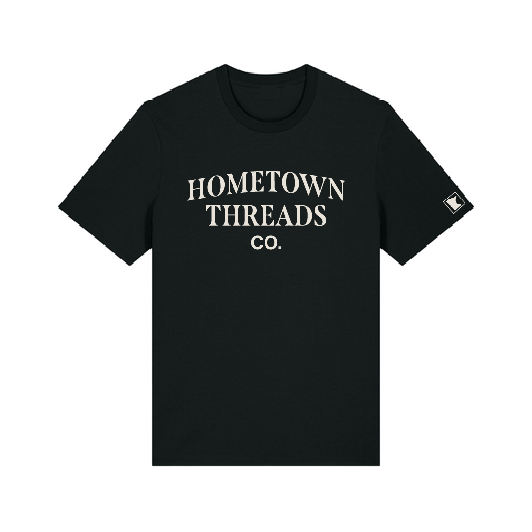 Front Print: “Hometown Threads Co.” arch logo in vintage bone ink.